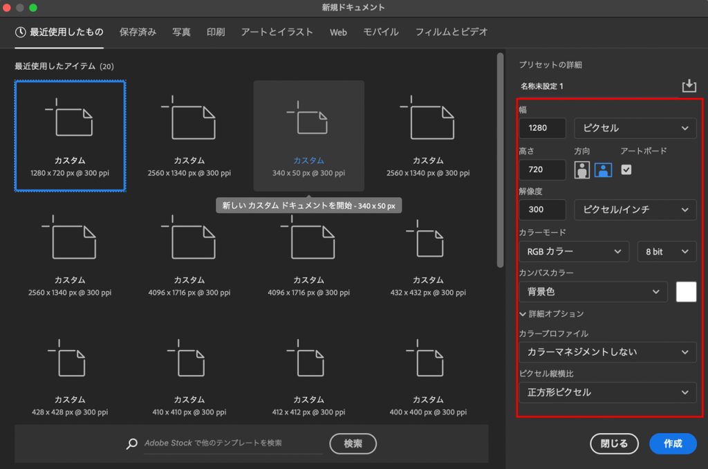 YouTubeのサムネイルを想定しているので、RGBカラー1280 × 720 px300dpi)で設定します。