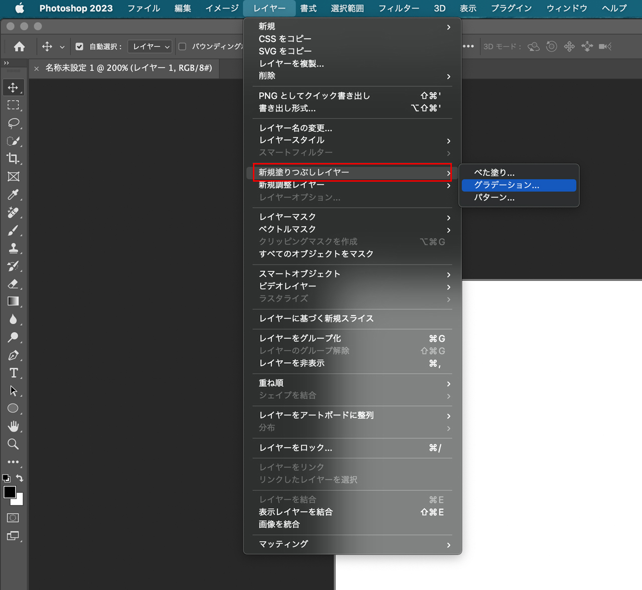 メニューの[レイヤー]→[新規塗りつぶしレイヤー]→[グラデーション]を選択