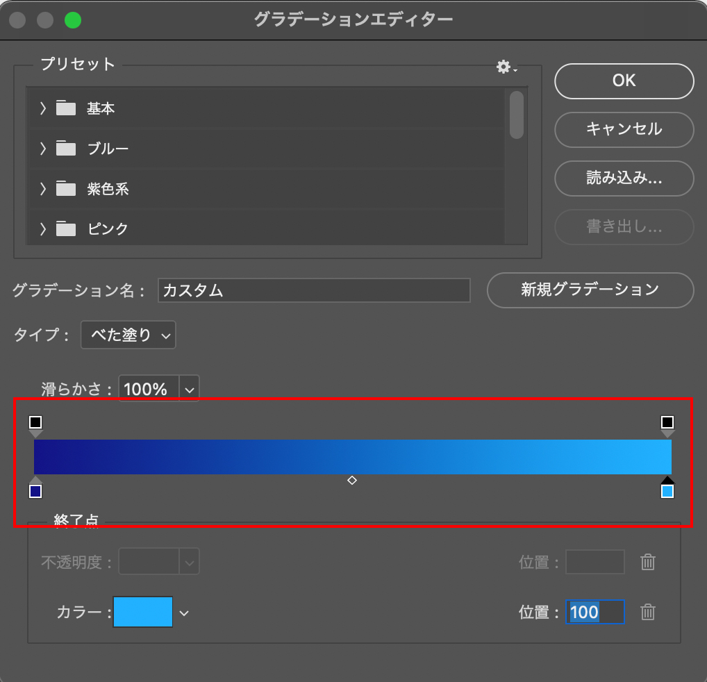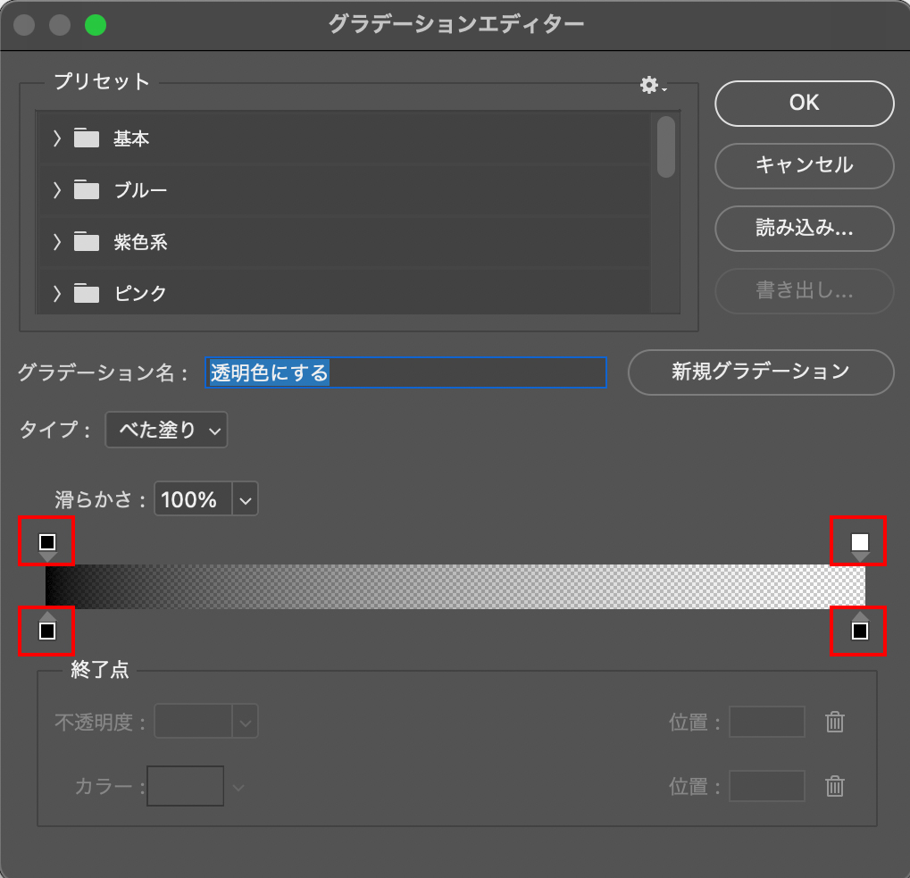グラデーションエディタが開きます。ここでグラデーションのカラーコードを設定します。